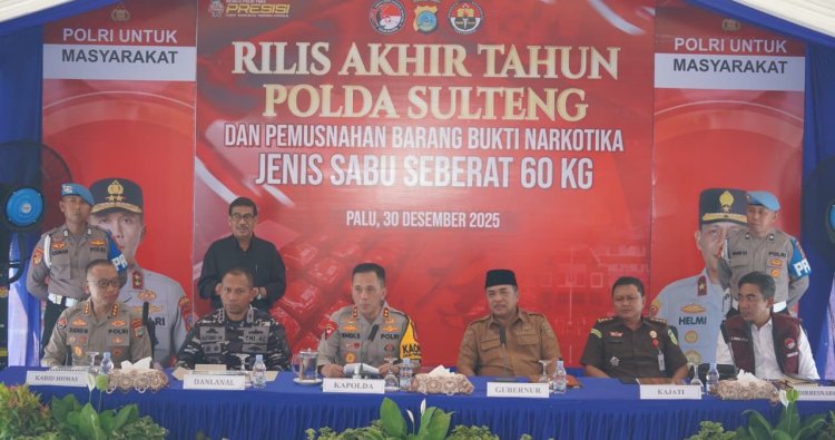 Palu-Sulawesi Tengah - Kepala Kepolisian Daerah Sulawesi Tengah Irjen Pol Dr. Endi Sutendi memimpin konferensi pers rilis akhir tahun 2025 yang dirangkaikan dengan pemusnahan barang bukti narkotika jenis sabu seberat sekitar 60 kilogram. Kegiatan tersebut berlangsung di Lobi Utama Polda Sulawesi Tengah, Selasa (30/12/2025).
