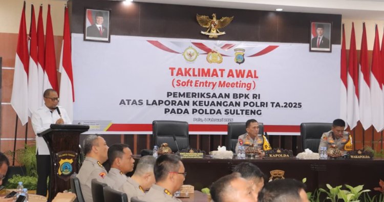 Palu – Kepolisian Daerah (Polda) Sulawesi Tengah (Sulteng) menggelar kegiatan Taklimat Awal (Soft Entry Meeting) Pemeriksaan Badan Pemeriksa Keuangan Republik Indonesia (BPK RI) atas Laporan Keuangan Polri Tahun Anggaran 2025, yang bertempat di Aula Rupatama lantai II Polda Sulawesi Tengah, Rabu 04/02/2026.